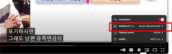 1) 유튜브 영상의 하단 톱니바퀴 모양 아이콘을 클릭 후 한국어로 자막설정